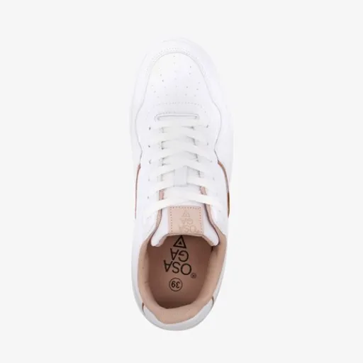 Witte sneakers voor dames van Osaga. Gemaakt van imitatieleer, een binnenwerk van textiel en een stevige profielzool. De sportschoenen hebben een vetersluiting en comfortabel voetbed van textiel. Deze is niet uitneembaar. Voorzien van stiknaden en roze details op het bovenwerk en een platte, witte buitenzool.