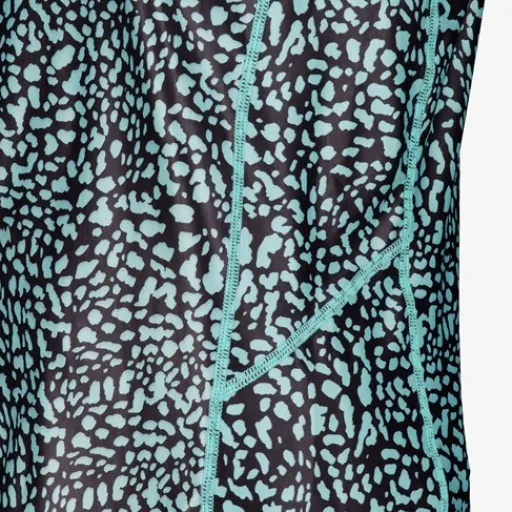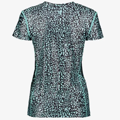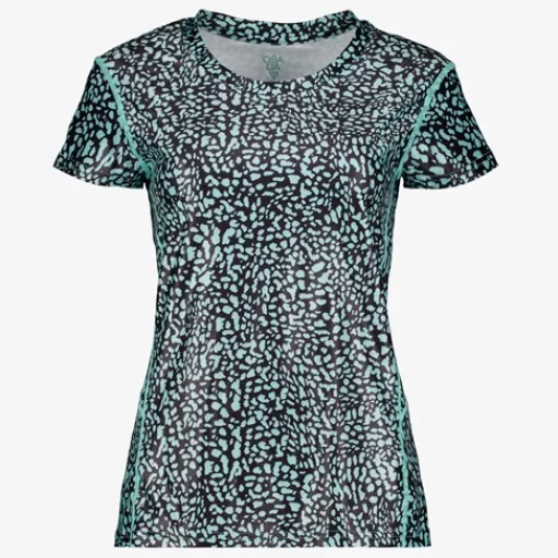 Blauw sport T-shirt voor dames van Osaga. Voorzien van een ronde hals, korte mouwen en een zwarte all over print. Het shirt heeft verstevigde naden en is gemaakt van 87% polyester en 13% elastaan.
