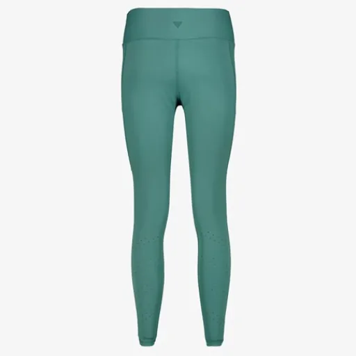 Blauwgroene sportlegging voor dames van Osaga. Voorzien van een brede, elastische tailleband en aansluitende pasvorm. De sportlegging heeft subtiele details op het onderbeen en is gemaakt van 79% polyester en 21% elastaan.