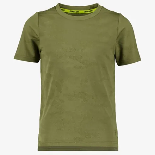 Mosgroen Osaga Dry sport T-shirt voor jongens. Voorzien van korte mouwen en een ronde, hoge hals. Dit sportshirt is vervaardig van sneldrogend materiaal en heeft een comfortabel pasvorm. Gemaakt van 100% polyester.