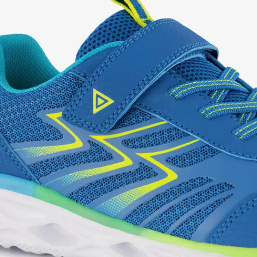 Blauwe sportschoenen voor jongens en meisjes van Osaga. Het buitenwerk is gemaakt van textiel en imitatieleer, het binnenwerk van textiel en de stevige zool met profiel is van rubber. Voorzien van elastische veters en een klittenbandsluiting voor een optimale pasvorm en aantreklusjes op de tong en hak voor een makkelijke instap. Het comfortabele voetbed van textiel is uitneembaar. De sneakers hebben een witte buitenzool en op het buitenwerk zijn gele en groene details aangebracht.