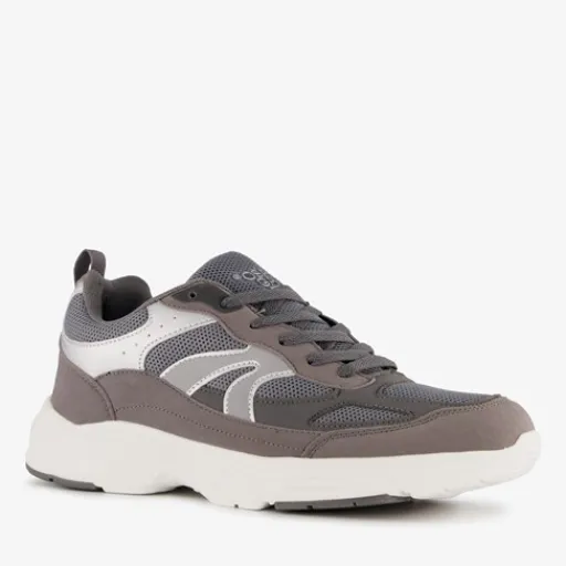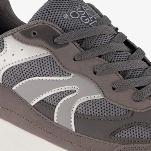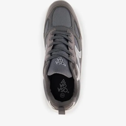 Grijze fitnessschoenen voor heren van Osaga. Het buitenwerk is gemaakt van mesh en imitatieleer, het binnenwerk van textiel en de buitenzool met profiel is van rubber. Voorzien van een vetersluiting, hiellusjes en een uitneembare binnenzool van textiel.