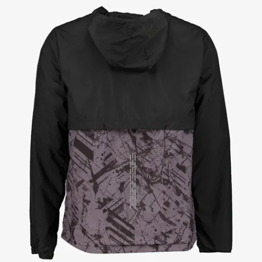 Zwarte hardloop anorak voor heren van Osaga. Voorzien van een capuchon met aantrekkoordjes, een korte ritssluiting en twee steekzakken aan de voorzijde. De onderkant van deze mooie sportjas is paars van kleur en heeft een grafisch printje. Daarnaast is de anorak voorzien van reflecterende accenten op de schouder en de rug zodat je goed opvalt in het donker. Gemaakt van polyester.