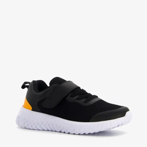Zwarte Osaga Play sneakers voor kinderen. Het buitenwerk is gemaakt van mesh en imitatieleer, het binnenwerk van textiel en de stevige profielzool van rubber. Voorzien van elastische veters en een klittenband voor een goede pasvorm en hiellusjes voor een makkelijke instap. Het comfortabele voetbed van textiel is uitneembaar zodat je eventueel jouw eigen zolen in de schoenen kan dragen. Deze gave sportschoenen hebben een opvallende witte zool en oranje vlakjes op de hakken.