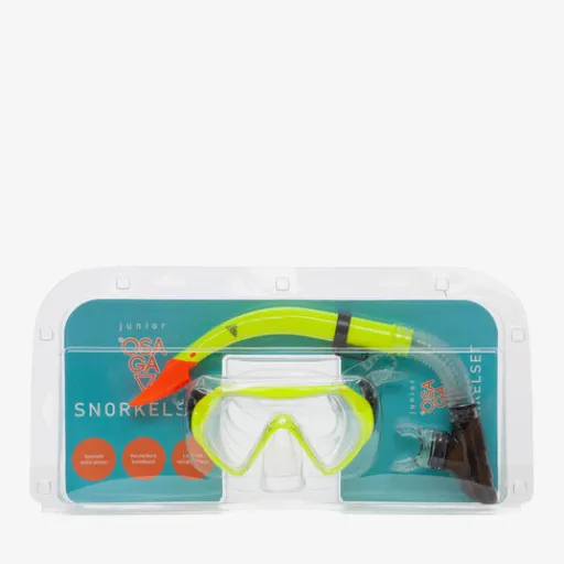 Gele snorkelset voor kids van Osaga. Het setje bestaat uit een bril met verstelbare hoofdband voor een aangename pasvorm en lens met veiligheidsglas. De snorkel is voorzien van speciale waterafvoer.