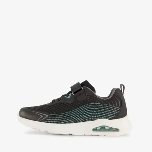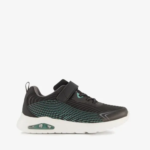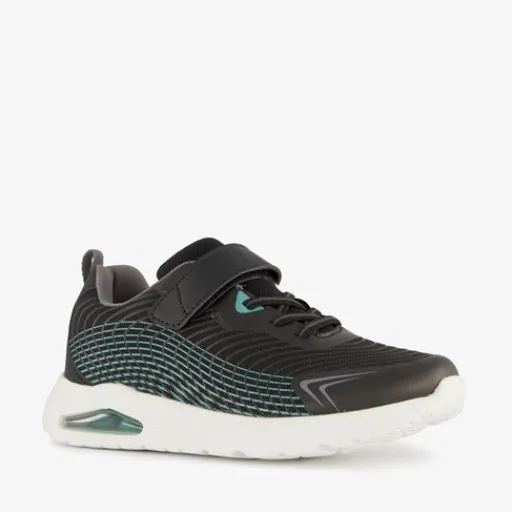 Zwarte sportschoenen voor kinderen. Gemaakt van textiel, een binnenwerk van textiel en een rubberen zool. De sportschoenen hebben elastische veters met klittenbandsluiting en een aantreklusje op de hiel. Het vaste voetbed is gemaakt van textiel. De sportschoenen hebben blauwe accenten op het bovenwerk en een airzool.