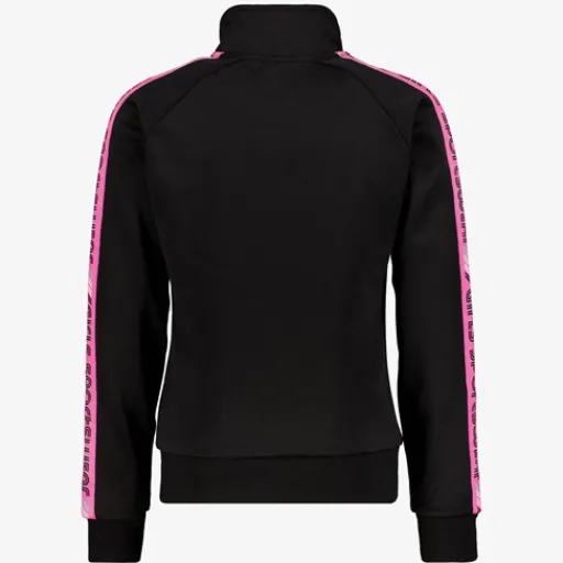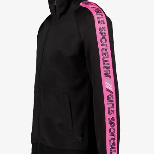 Zwarte trainingsjas voor meisjes van Osaga. Voorzien van een hoge kraag, een ritssluiting en twee steekzakken. De trainingsjas heeft roze accenten op de armen met tekst opdruk en elastiek in de boorden. Gemaakt van 80% polyester en 20% katoen.