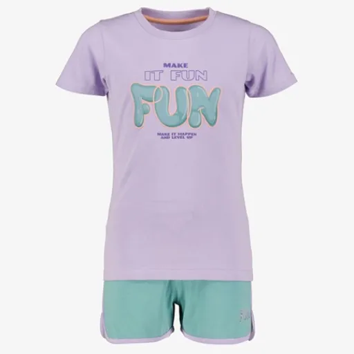 Dit meisjes sport setje is ideaal voor gym of fitness. De set bestaat uit een paars T-shirt met een leuke tekstopdruk aan de voorzijde, een ronde hals en korte mouwen. De groene short heeft aantrekkoordjes en een tekstopdruk op de bovenbeen. Dit Osaga sport setje voor meisjes is gemaakt van 95% katoen en 5% elastaan.