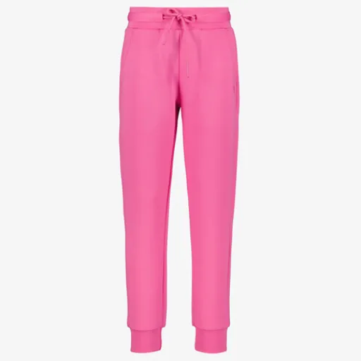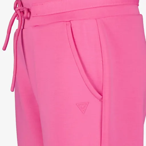 Roze trainingsbroek voor meisjes van Osaga. Voorzien van een elastische tailleband met aantrekkoordjes, twee steekzakken aan de voorzijde, een achterzakje en elastische broekspijpen. Gemaakt van 72% polyester, 23% viscose en 5% elastaan.