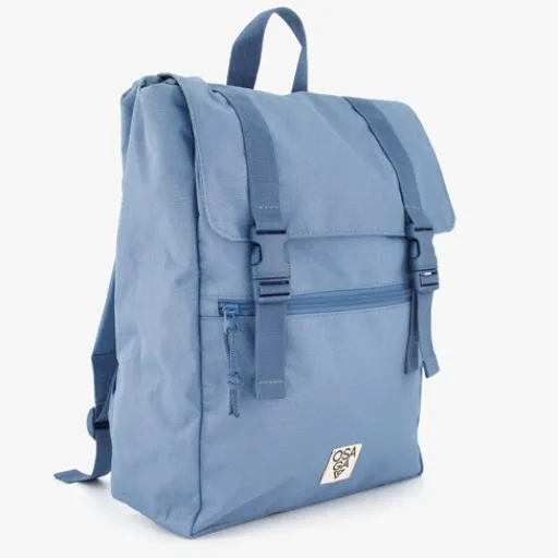 Blauwe rugzak van Osaga. Voorzien van een stevige draaglus aan de bovenzijde, gewatteerde, verstelbare schouderbanden en een voorvak met ritssluiting. De tas heeft een ruim hoofdvak dat je kunt afsluiten met een aantrekkoord en gespen. Afmetingen: 38 × 26 × 12 cm. Inhoud: 12 liter. Gemaakt van polyester en kunststof.