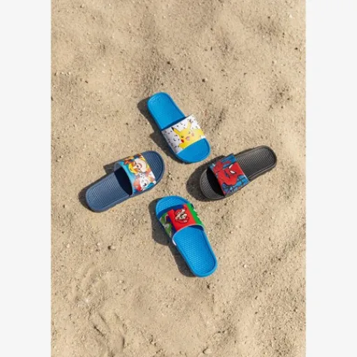 Blauwe Pokémon badslippers voor jongens en meisjes. Gemaakt van imitatieleer met een profielzool van rubber. De slippers hebben een brede, comfortabele voetband met vrolijke opdrukken van Pikachu.