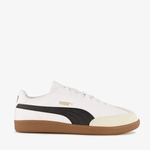 Lage, witte Puma 9-T sneakers voor heren. Gemaakt van imitatieleer en suede, een binnenwerk van textiel en een rubberen zool. De sneakers hebben een vetersluiting en een comfortabele, dempende binnenzool van textiel.