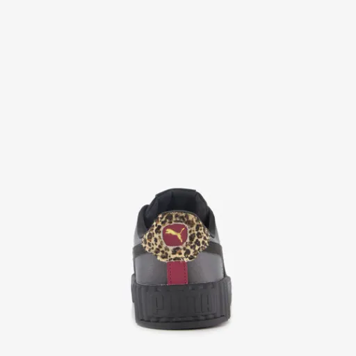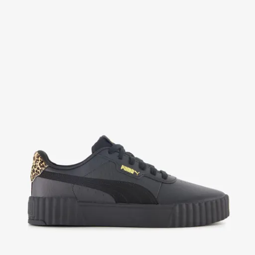 Zwarte Puma Carina 3.0 dames sneakers. Het buitenwerk is gemaakt van imitatieleer, het binnenwerk van textiel en de plateauzool met profiel is van rubber. Voorzien van een vetersluiting en een uitneembare binnenzool van textiel. De sneakers hebben op de hak een panterprint detail en op het bovenwerk zijn goudkleurige merkopdrukken aangebracht.