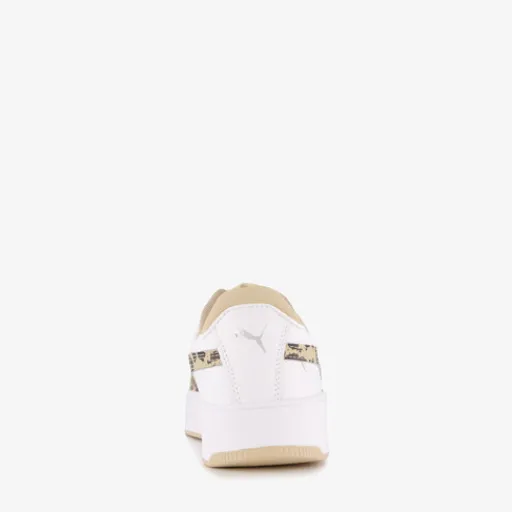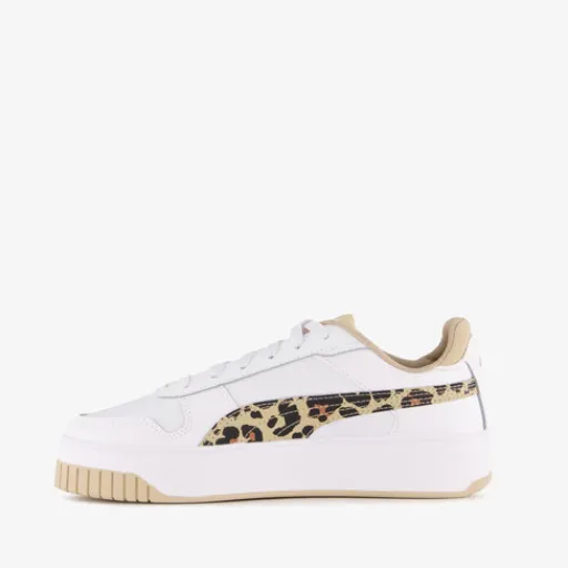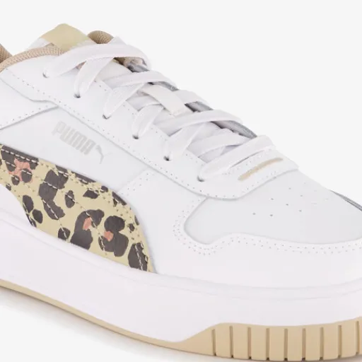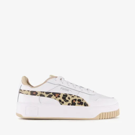 Witte Puma Carina Street Animal Flair sneakers voor dames. Het bovenwerk is gemaakt van imitatieleer, het binnenwerk van textiel en de stevige zool met profiel is van rubber. Voorzien van een vetersluiting en een comfortabele binnenzool van textiel. Deze is uitneembaar. De sneakers hebben beige details en Puma Formstrips met panterprint op de zijpanden.