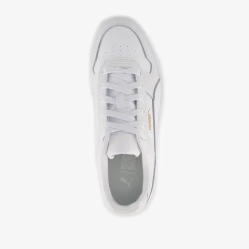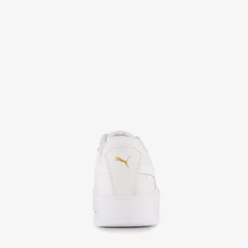 Witte Puma Carina Street sneakers voor meisjes. Het buitenwerk is gemaakt van imitatieleer, het binnenwerk van textiel en de stevige, plateauzool met profiel is van rubber. Voorzien van een vetersluiting, een uitneembare binnenzool van textiel en goudkleurige merkopdrukken.