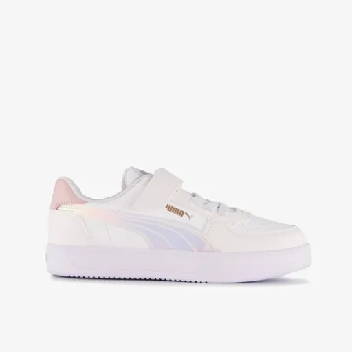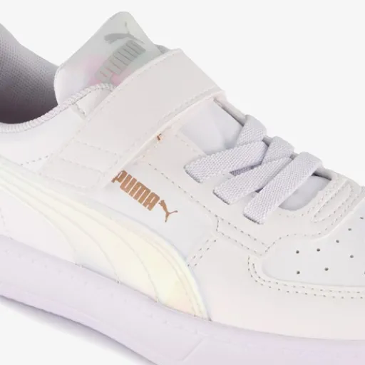 Lage, witte Puma Caven Holo 2.0 AC+ PS kinder sneakers. Gemaakt van imitatieleer, een binnenwerk van textiel en een rubberen zool. De sneakers hebben elastische veters met klittenbandsluiting en een comfortabel SoftFoam+ voetbed die demping biedt. Voorzien van een holografische Formstrip op de zijkanten.