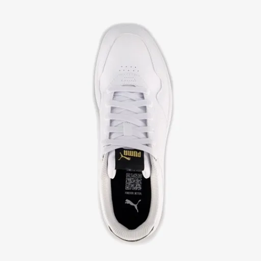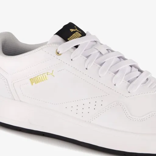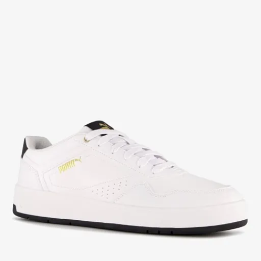 Lage, witte Puma Court Classic sneakers voor heren. Gemaakt van imitatieleer, een binnenwerk van textiel en een rubberen zool. De sneakers hebben een vetersluiting en SoftFoam voetbed van textiel. Deze is uitneembaar.