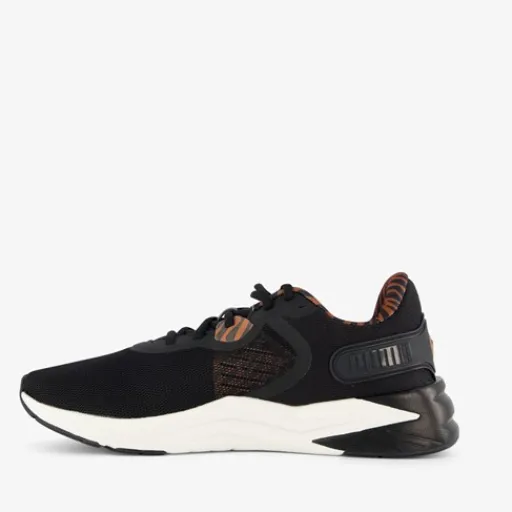 Zwarte Puma Disperse XT 3 sneakers voor dames. Het ademende buitenwerk is gemaakt van textiel, het binnenwerk van textiel en de stevige profielzool van rubber. Deze lichtgewicht schoenen zijn niet alleen als casual schoen te dragen maar ook als sportschoen. De schoenen worden versierd met tijgerprint details en Puma merkopdrukken. Het uitneembare SOFTFOAM+ voetbed zorgt voor demping en comfort.