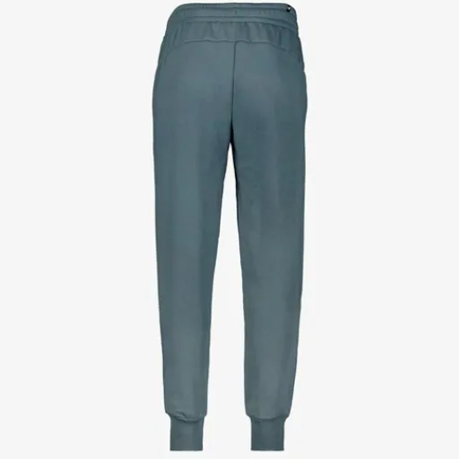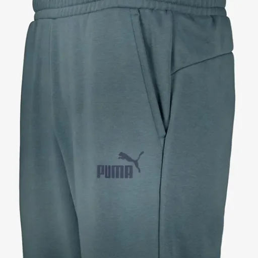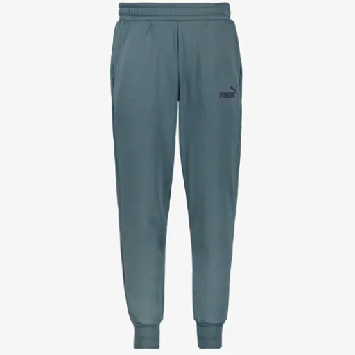 Blauwgrijze Puma Ess Logo FL CL joggingbroek voor heren. Voorzien van een elastische tailleband, twee steekzakken aan de voorzijde en elastische boorden bij de broekspijpen. De broek heeft een merkopdruk op de bovenbeen en is gemaakt van 66% katoen en 34% polyester.