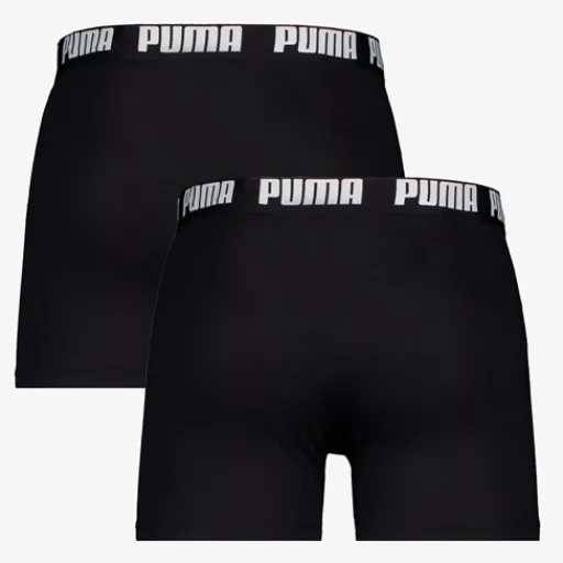 2 zwarte heren boxershorts van Puma. De boxers hebben een brede, elastische tailleband met witte merkopdrukken. Gemaakt van 95% katoen en 5% elastaan. Let op: dit product mag niet geretourneerd worden i.v.m. hygiƫne.