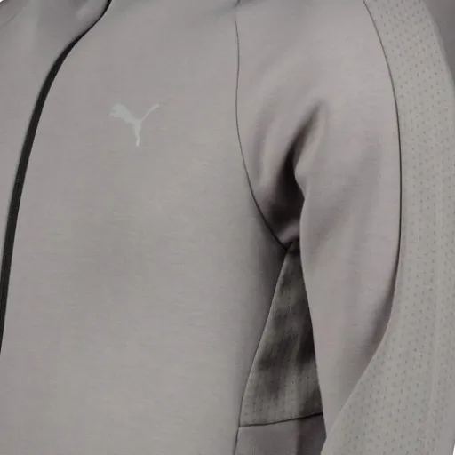 Grijze Puma Evostripe FZ vest voor heren. Voorzien van een capuchon met aantrekkoordjes, een riutssluiting en twee steekzakken met rits aan de voorzijde. Door de snijlijnen heb je meer bewegingsvrijheid en de dryCELL prestatietechnologie voert het vocht gemakkelijk weg zodat jij je fris blijft voelen. Gemaakt van 77% katoen en 23% polyester.