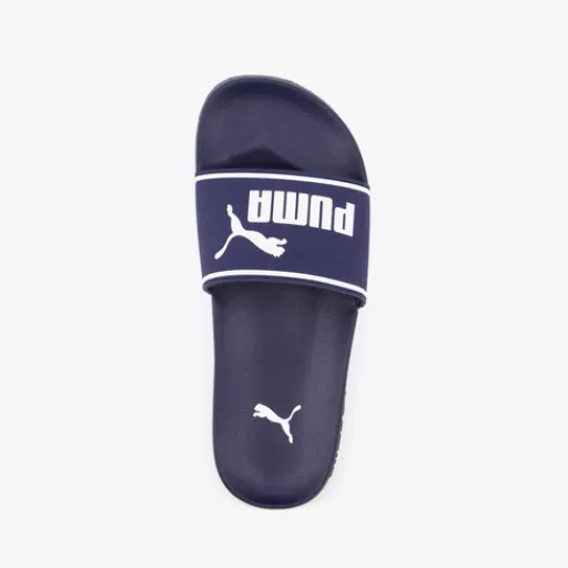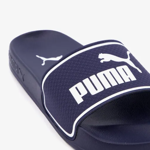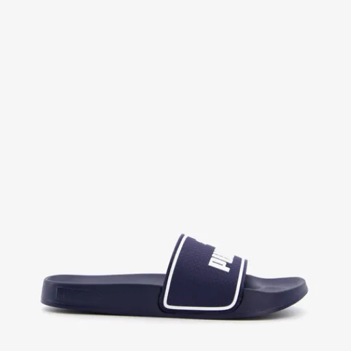 Donkerblauwe Puma Leadcat 2.0 badslippers. Deze heerlijk comfortabele badslippers van Puma zijn ideaal voor in huis, in de sportschool of naar het zwembad. Gemaakt van synthetisch materiaal, met een comfortabel voetbed en een brede band met merkopdruk.