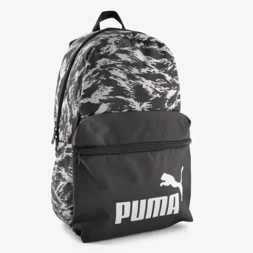 Grijs-zwarte Puma Phase AOP rugzak met print en een witte merkopdruk aan de voorzijde. Voorzien van een stevige draaglus en verstelbare, gewatteerde schouderbanden. De tas heeft een ruime hoofdvak met ritssluiting, een voorvak met rits en een mesh vakje aan de zijkant waar je een drinkfles in kwijt kan. Afmetingen: 30 x 14 x 44 cm. De inhoud is 22 liter. Gemaakt van polytester.