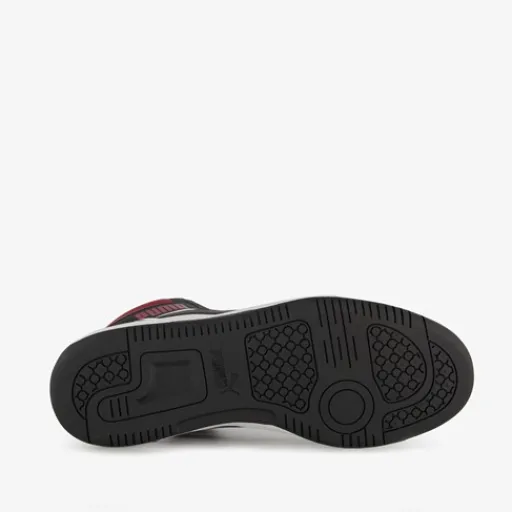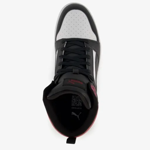 Hoge, rood/witte Puma Rebound V6 heren sneakers. Het buitenwerk is gemaakt van imitatieleer, het binnenwerk van textiel en de stevige buitenzool met profiel is van rubber. Voorzien van een vetersluiting en hiellusjes. Het comfortabele voetbed van textiel is uitneembaar. De Puma Rebound V6 sneakers worden versierd met merkopdrukken op het buitenwerk, zwarte Puma Formstrips en zwarte details.