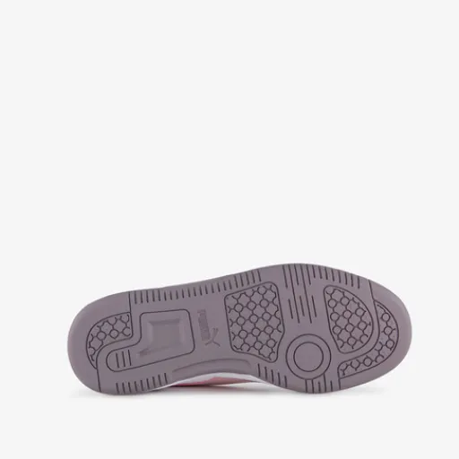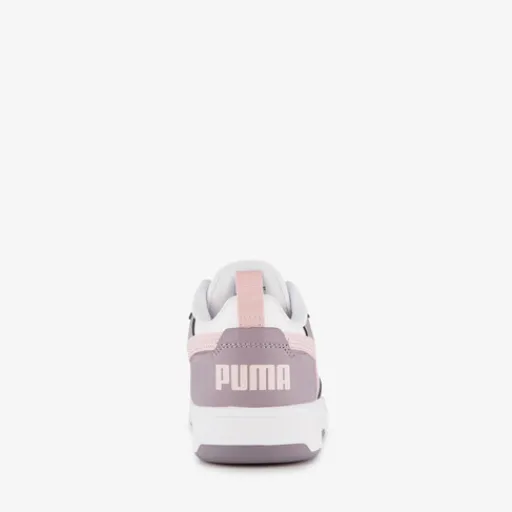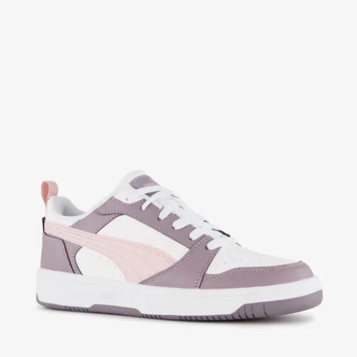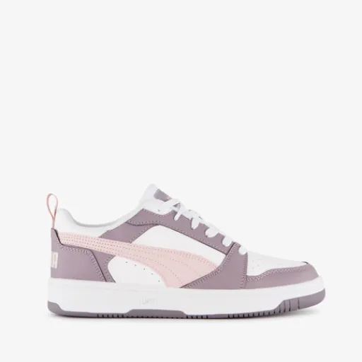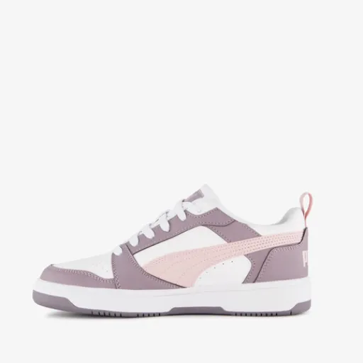 Paars-witte Puma Rebound V6 Low sneakers voor dames. Het buitenwerk is gemaakt van imitatieleer, het binnenwerk van textiel en de stevige zool met profiel is van rubber. Voorzien van een vetersluiting, hiellusjes en een comfortabele binnenzool van textiel. Deze is uitneembaar zodat je eventueel je eigen zolen in de schoenen kan dragen. De sneakers hebben perforatiegaatjes op het bovenwerk en aan de zijkanten zijn roze Puma Formstrips aangebracht.