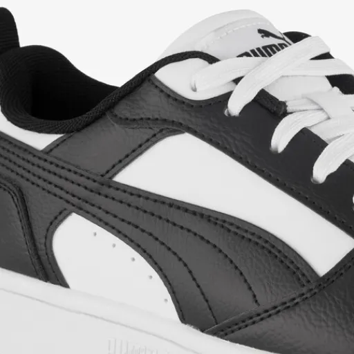 Zwart-witte Puma Rebound V6 Low sneakers voor dames. Het buitenwerk is van imitatieleer gemaakt, het binnenwerk van textiel en de stevige zool met profiel is van rubber. Voorzien van een vetersluiting, hiellusjes en een comfortabele binnenzool van textiel. Deze is uitneembaar. De Puma Rebound V6 Low sneakers zijn geïnspireerd door basketbalschoenen. De sneakers hebben perforatiegaatjes op het bovenwerk die voor ventilatie zorgen.