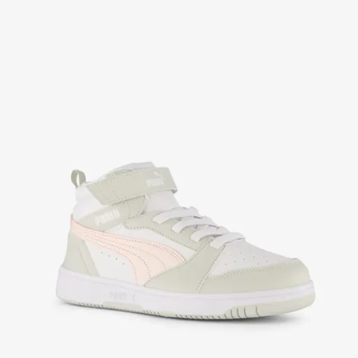 Grijs/witte Puma Rebound V6 Mid sneakers voor meisjes. Het buitenwerk is gemaakt van imitatieleer, het binnenwerk van textiel en de stevige profielzool van rubber. De sneakers hebben perforatiegaten op het buitenwerk en een uitneembaar voetbed met Soft Foam wat voor comfort zorgt. Voorzien van elastische veters met klittenbandsluiting voor een goede pasvorm en een hiellusjes voor een makkelijk instap. Deze mooie sneakers worden versierd met merkopdrukken en roze Puma Formstrips op het buitenwerk.