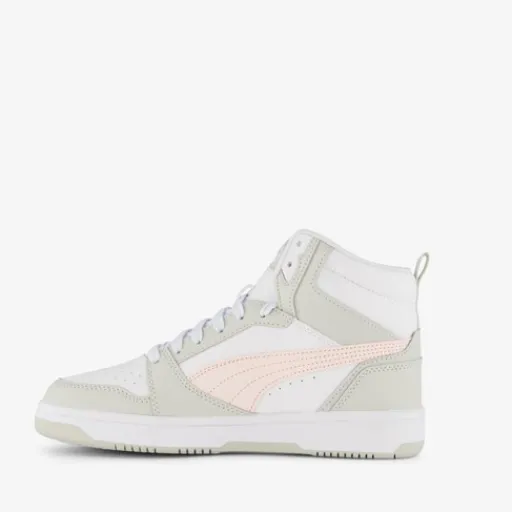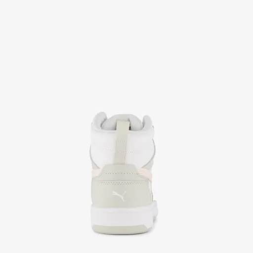Grijs, witte Puma Rebound V6 Mid sneakers voor meisjes. Het buitenwerk is gemaakt van imitatieleer, het binnenwerk van textiel en de stevige profielzool van rubber. De sneakers hebben perforatiegaten op het buitenwerk en een uitneembaar voetbed met Soft Foam wat voor comfort zorgt. Voorzien van een vetersluiting voor een goede pasvorm en een hiellusjes voor een makkelijk instap. Deze mooie sneakers worden versierd met merkopdrukken en roze Puma Formstrips op het buitenwerk.