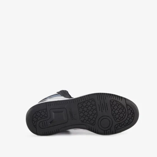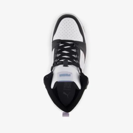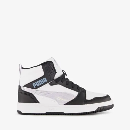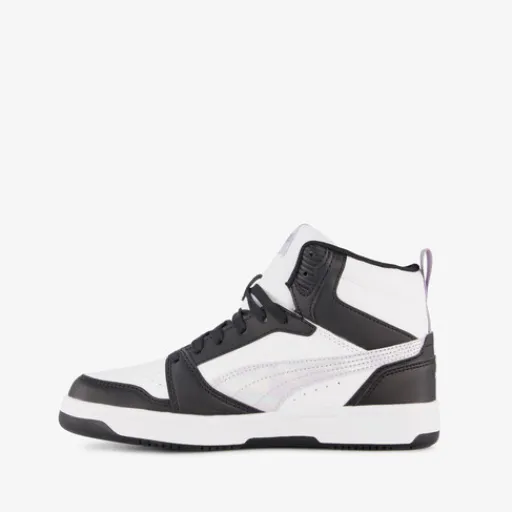 Zwart-witte Puma Rebound V6 Mid Space Belle sneakers voor meisjes. Het buitenwerk is gemaakt van imitatieleer, het binnenwerk van textiel en de stevige zool met profiel is van rubber. Voorzien van een vetersluiting, hiellusjes en een uitneembare binnenzool van textiel. Deze hoge Puma sneakers hebben lila accenten op buitenwerk en aan de zijkanten zijn Puma Formstrips aangebracht.