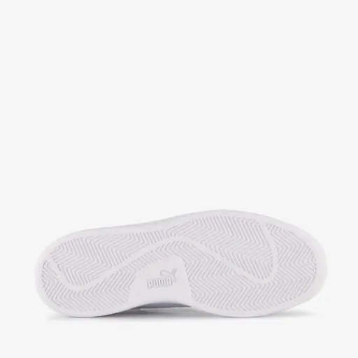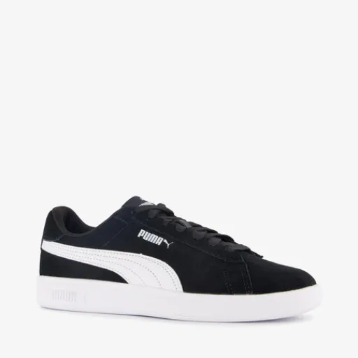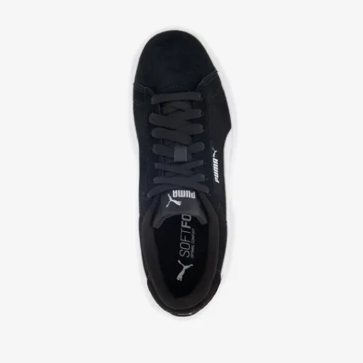Zwart-witte Puma Smash 3.0 sneakers voor dames. Het buitenwerk is gemaakt van suède, het binnenwerk van textiel en de profielzool is van rubber. Voorzien van een vetersluiting en een uitneembare binnenzool met Soft Foam. Deze biedt demping en comfort. De sneakers hebben een contrasterende witte buitenzool en witte Puma Formstrips op de zijpanden.