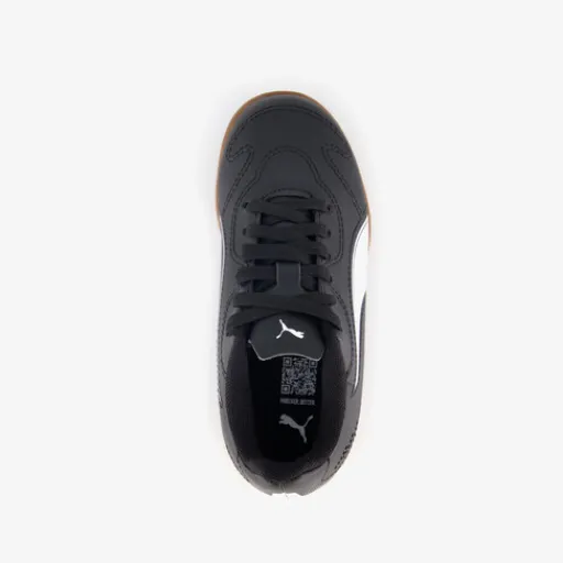 Zwarte Puma Vitoria II IT zaalschoenen voor kinderen. Het buitenwerk is gemaakt van imitatieleer, het binnenwerk van textiel en de non-marking profielzool is van rubber. Voorzien van een vetersluiting en een comfortabele binnenzool van textiel. Deze is uitneembaar. De zaalschoenen hebben witte details op het bovenwerk en een bruine buitenzool.