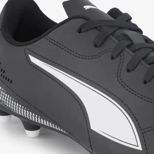 Zwarte Puma Vitoria II MG voetbalschoenen voor heren. Het buitenwerk is gemaakt van imitatieleer, het binnenwerk van textiel en de lichte zool is van rubber. Voorzien van een vetersluiting en een uitneembaar comfortabel voetbed van textiel. De MG noppenconstructie is geschikt voor zowel natuurgras- als kunstgrasvelden. De voetbalschoenen hebben wit design op het bovenwerk.