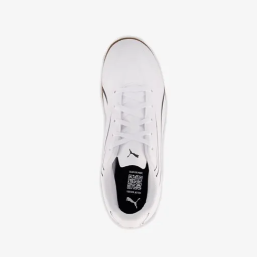 Witte Puma Vitoria IT zaalschoenen voor kinderen. Het buitenwerk is gemaakt van imitatieleer, het binnenwerk van textiel en de flexibele non-marking zolen van rubber. Voorzien van een vetersluiting voor een goede pasvorm en een comfortabel, uitneembaar voetbed van textiel. Deze schoenen worden versierd met zwarte accenten op het buitenwerk en bruine, rubberen zolen die voor veel grip en snelheid zorgen in de zaal.