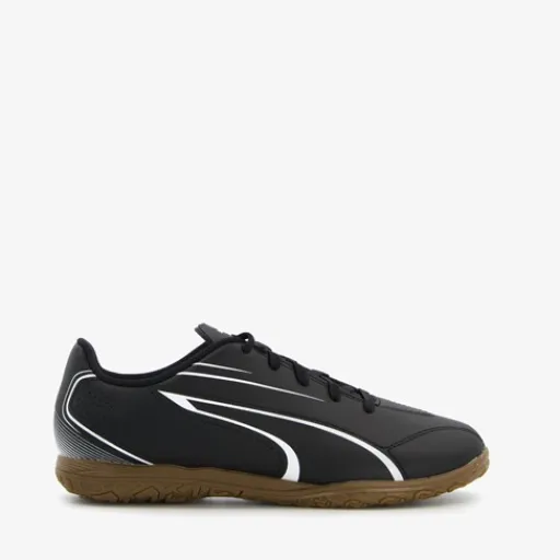 Zwarte Puma Vitoria IT zaalschoenen voor kinderen. Het buitenwerk is gemaakt van imitatieleer, het binnenwerk van textiel en de flexibele non-marking zolen van rubber. Voorzien van een vetersluiting voor een goede pasvorm en een comfortabel, uitneembaar voetbed van textiel. Deze schoenen worden versierd met witte accenten op het buitenwerk en bruine, rubberen zolen die voor veel grip en snelheid zorgen in de zaal.