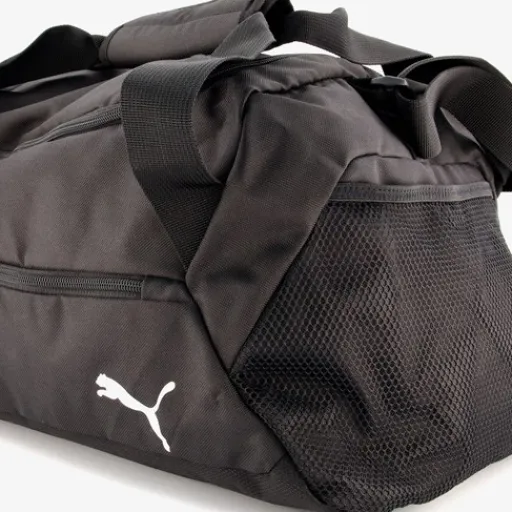 Zwarte Puma teamGOAL S sporttas. Voorzien van een verstelbare draagband en twee stevige draaggrepen die je aan elkaar vast kan maken met een klittenband. De sporttas heeft een ruime hoofdvak met dubbele ritssluiting, een vooor- en zijvak met rits en een mesh vakje aan de zijkant. Gemaakt van polyester. Inhoud is 29 liter. Afmetingen: 45 x 27 x 24 cm.