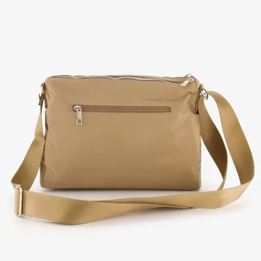 Beige schoudertas voor dames van Renato Lucci. Voorzien van een verstelbare schouderband, twee hoofdvakken met ritssluting en een voor- en achtervak met ritssluiting. De schoudertas heeft zilverkleurige hardware. Gemaakt van nylon. Afmetingen: 29,5 x 9,5 x 21,5 cm.