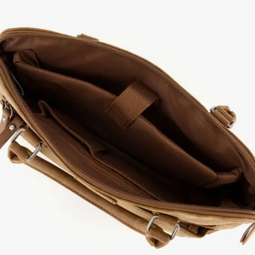 Grote hand/schoudertas met verstelbare, afneembare schouderband. De tas heeft een achtervak en twee voorvakken met rits. Het grote hoofdvak met ritssluiting bevat extra vakjes, waaronder eentje voor je laptop of boeken. De tas is gemaakt van imitatieleer. Afmetingen: 31x8x24 cm.