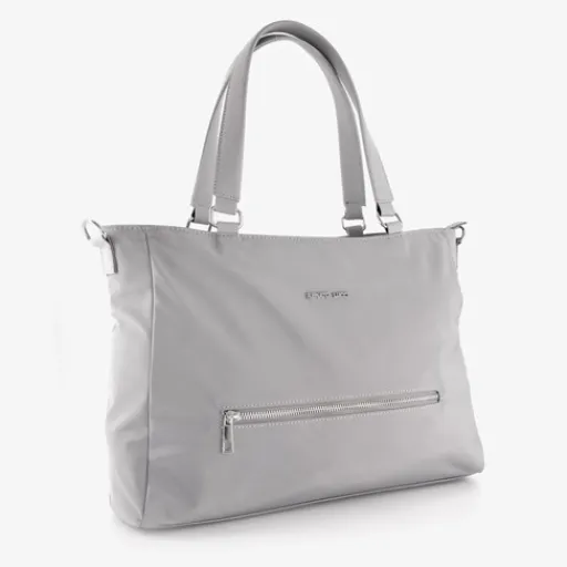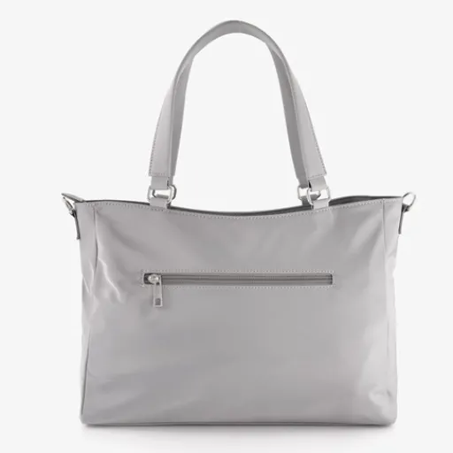 Grijze schoudertas voor dames van Renato Lucci. Voorzien van twee stevige draaglussen aan de bovenzijde en een verstelbare, afneembare schouderband. De tas heeft een ruime hoofvak met meerdere binnenvakjes met ritssluiting en een voor- en achtervak met ritssluiting. De hardware van de tas is zilverkleurige. De tas is gemaakt van nylon. Afmetingen: 36 x 10 x 25 cm.
