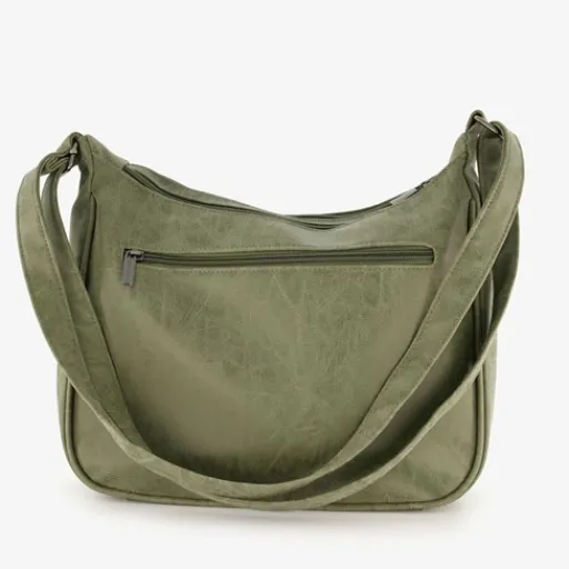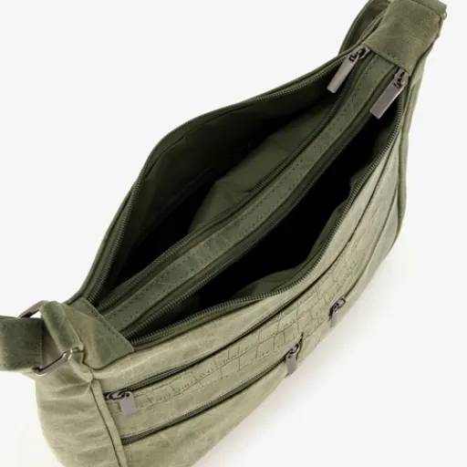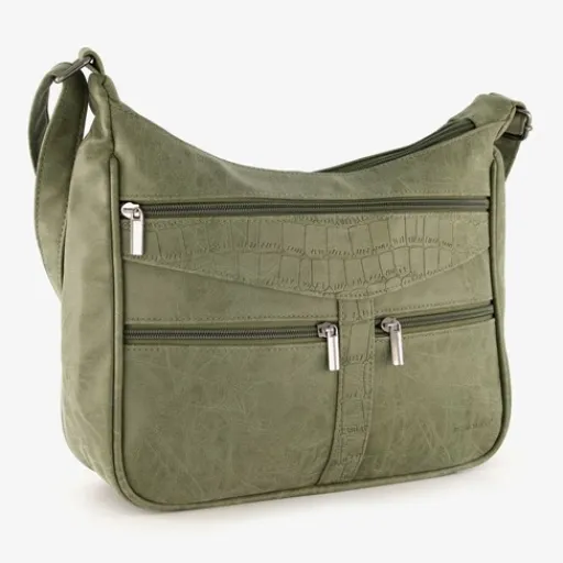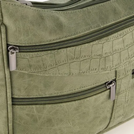 Groen schoudertas van Renato Lucci. Voorzien van een schouderhengsel, een achtervak, drie voorvakken met rits en twee grote hoofdvakken met ritssluiting. De tas heeft subtiel croco dessin en is gemaakt van imitatieleer. Afmetingen: 28x11x24 cm.