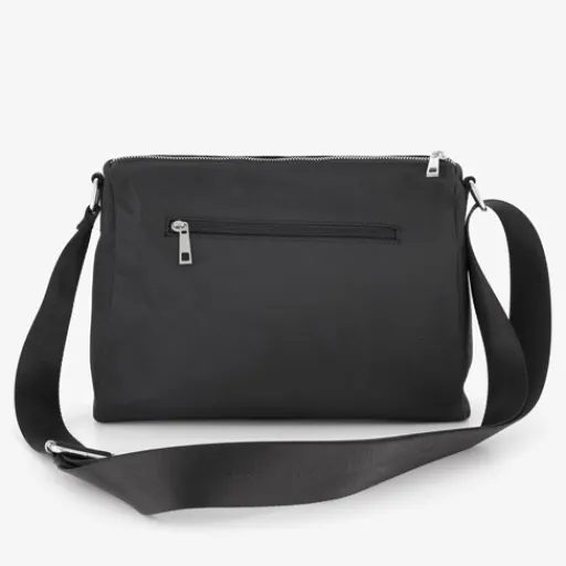 Zwarte schoudertas voor dames van Renato Lucci. Voorzien van een verstelbare schouderband, twee hoofdvakken met ritssluting en een voor- en achtervak met ritssluiting. De schoudertas heeft zilverkleurige hardware. Gemaakt van nylon. Afmetingen: 29,5 x 9,5 x 21,5 cm.