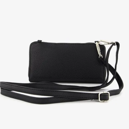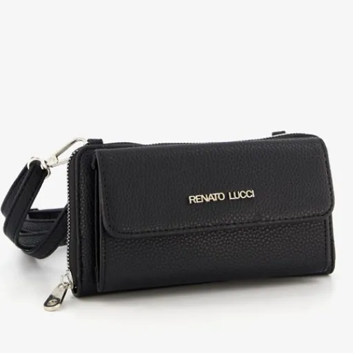 Zwarte portemonnee tasje van Renato Lucci. Voorzien van een afneembare, verstelbare schouderhengsel en hoofdvak met hiermee vakjes voor al je pasje, geld en andere spulletjes. Het tasje heeft ook een hoofdvak met een drukknop. Gemaakt van imitatieleer. Afmetingen: 19 x 2,5 x 10,5 cm.