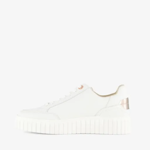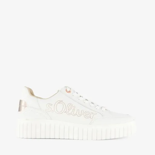 Witte s.Oliver dames sneakers met rosékleurige metallic details. Gemaakt van imitatieleer met een binnenwerk van textiel en een stevige plateauzool van rubber. De sneakers zijn voorzien van een vetersluiting en een comfortabele binnenzool van textiel. Deze is uitneembaar.