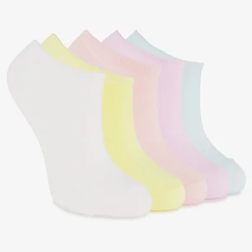 5 paar sneakersokken voor meisjes in de kleuren roze, wit, geel en blauw. Gemaakt van 75% katoen, 22% polyester en 3% elastaan.