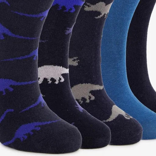 Vijf paar halflange sokken sokken in de kleur blauw. Voorzien van dino print en gemaakt van 70% katoen. 28% polyester en 2% elastaan.