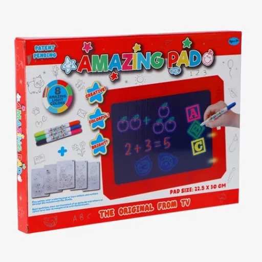 Ontdek de verbazingwekkende wereld van tekenen met de Amazing Pad! Laat je creativiteit de vrije loop en breng je kunstwerken tot leven met verschillende kleuren licht. Wanneer het donker wordt, zul je versteld staan van het spectaculaire effect dat deze pad creƫert. De Amazing Pad wordt geleverd met 3 dubbelzijdige stiften, 5 sjablonen en een handig schoonmaakdoekje. Houd er rekening mee dat batterijen niet zijn inbegrepen. Dit creatieve speelgoed is geschikt voor kinderen vanaf 3 jaar en biedt urenlang plezier en verbeeldingskracht!