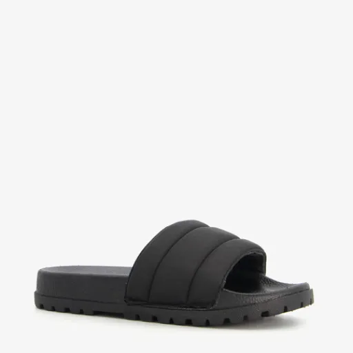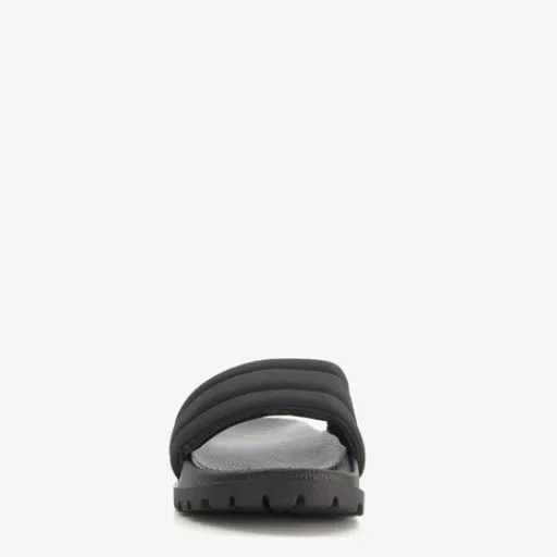 Zwarte badslippers voor dames. Voorzien van een brede band bij de tenen gemaakt van textiel en een stevige zool met profiel van rubber.